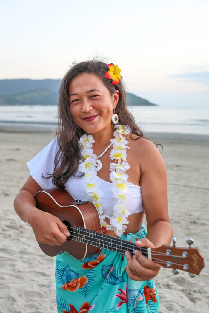 Lilian Abe – A Sayuri, que também é vocalista e baixista da banda Los Clandestinos, é musicista experiente e multi instrumentista com mais de 15 anos de carreira; o ukulele era um amor antigo dela. Então, quando propus para ela começar a tirar e cantar as músicas em havaiano e taitiano, ela super topou o desafio. Desde então, começamos a fazer apresentações esporádicas junto da escola de Hula, onde faço aula.