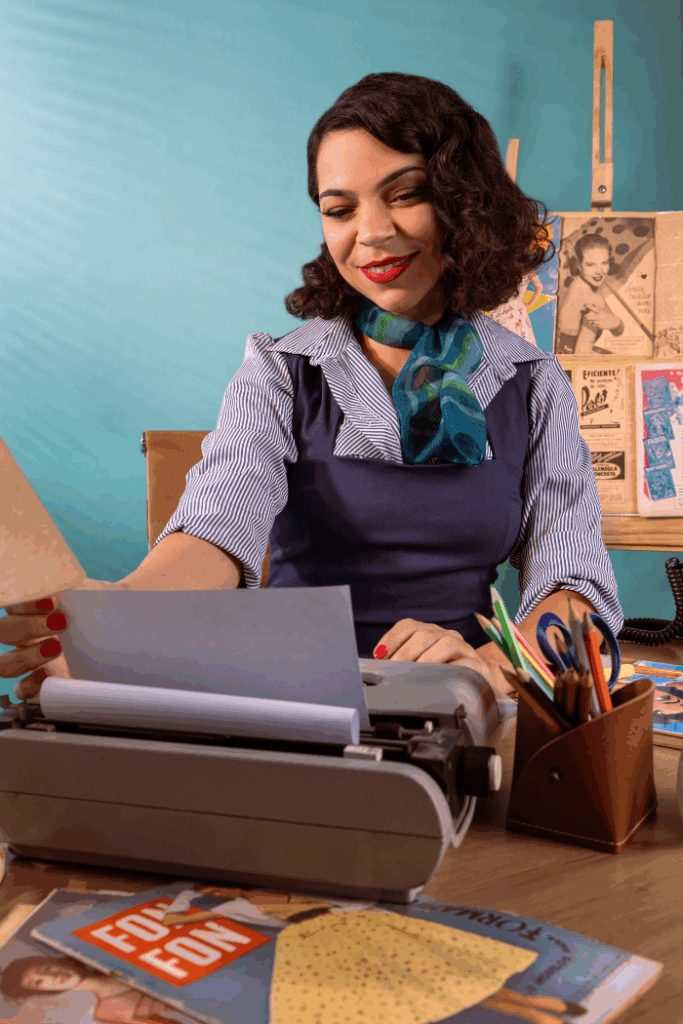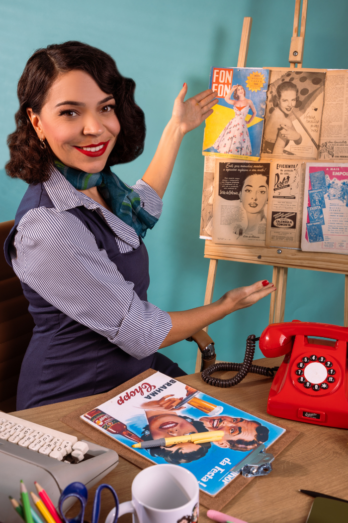 Ao me colocar nesse cenário, me conecto simbolicamente com as profissionais criativas da época, muitas vezes invisibilizadas pela história, mas que ajudaram a construir narrativas de consumo. Aqui, ocupo um espaço, não só fantasioso sobre o que seria uma agência do passado, mas também trago o protagonismo da minha própria história profissional.