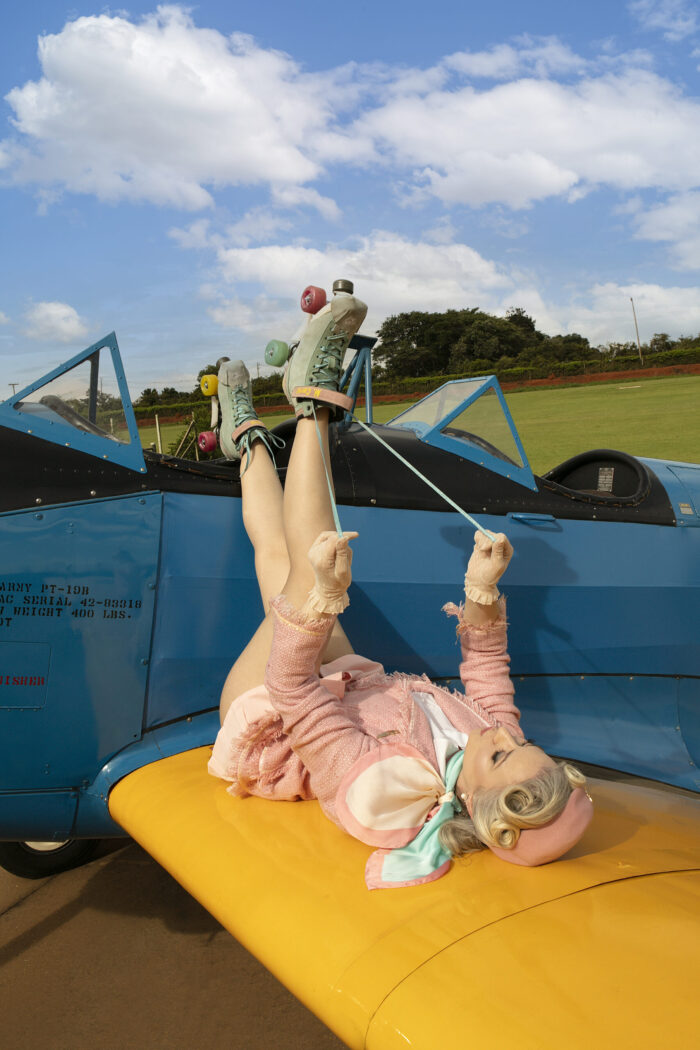 Maria Carolina Chiavelli – Desde o começo a equipe te deixa muito à vontade. Escolhi um estilo menos sensual e mais divertido, que é como me reconheço no mundo sobre rodas. Mas essa mistura com o universo pin-up foi a cereja do bolo do ensaio. Eu estava completamente encantada pela arte feita com os meus cabelos, com todos aqueles detalhes do figurino que representavam perfeitamente a minha profissão — tudo na paleta de cores dos meus patins retrô e combinando com a aeronave. Foi essa imersão num “filme” vintage que me motivou a embarcar nessa aventura!